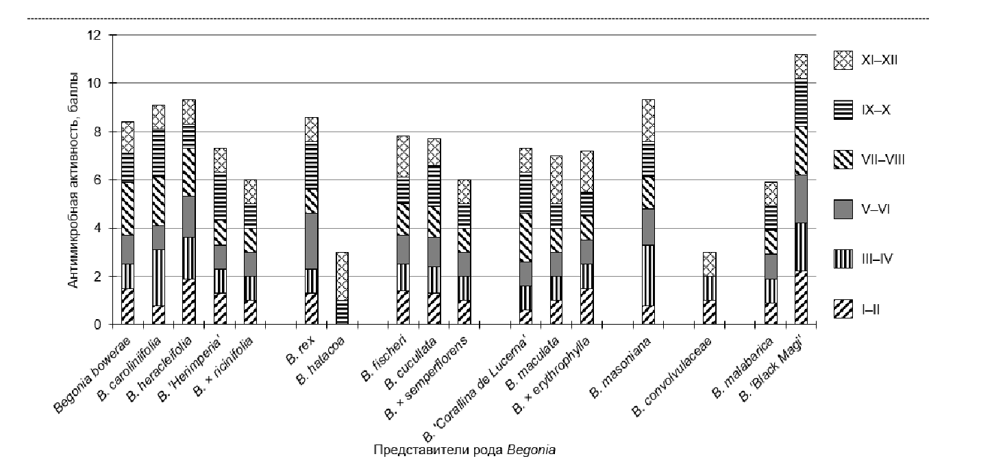 Наиболее перспективными объектами для фитодизайна является большинство представителей секции Gireoudea, проявивших выраженную и продолжительную антимикробную активность в отношении тест-объектов. Экстракты таксонов секции Gireoudia оказались специфичными по составу агликонов флавонолов, с преобладанием гликозидов кверцетина и кемпферола, в отличие от остальных образцов, содержащих только кверцетин [7]. Универсальную, выраженную и продолжительную активность проявили следующие образцы бегоний: B. caroliniifolia, B. heracleifolia, B. bowerae (секция Gireoudea). Следует отметить вид B. masoniana из секции Coelocentrum с продолжительной активностью в течение всего года к бактериям кишечной палочки.