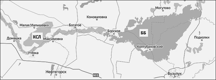 Рисунок 1 – Расположение изучаемых лесных массивов. КСЛ и ББ (здесь и далее на рисунках и в таблицах) – Красносамарский лесной массив и Бузулукский бор соответственно
