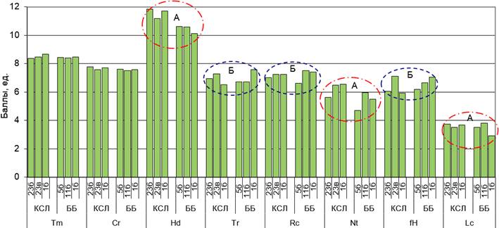 Рисунок 2 – Результаты оценки экологических условий в модельных насаждениях в соответствии со шкалами Д.Н. Цыганова. А – обозначение режимов, для которых прослеживаются различия между условиями Красносамарского леса и Бузулукского бора; Б – обозначения режимов, для которых более существенна изменчивость между модельными площадками внутри насаждений