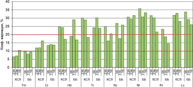 На рис. 3 отражены значения коэффициентов вариации, полученные в ходе статистической обработки количественных показателей всех экологических режимов. Наибольшим уровнем изменчивости характеризовались значения балльных оценок видов по приуроченности к условиям светового режима и обеспеченности почв азотом (коэффициент вариации более 20%, что характеризует показатели как пластичные), наименьшим – по отношению к температурному режиму (коэффициент вариации ≤10%, что соответствует стабильности показателей) [19, с. 41].