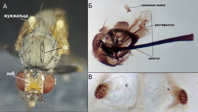 Длина тела самки достигает 2,6 мм, орбитальные щетинки наклонены вперед. Лоб шире глаз в 2 раза и сбоку не выпячен от них. Имеется одна пара нижних орбитальных (ori) и 2 равные верхние орбитальные (ors) щетинки, акростихальные щетинки (acr) обычно отсутствуют (рис. 1: А). Третий антенный сегмент круглый, черный, покрыт короткими волосками. Щупальца (palps) черные. По имеющимся данным, максимальная длина крыла самцов составляет 2,2 мм, а у самок – 2,6 мм. Коста заканчивается на границе жилки R₄₊₅. Вершинный отрезок крыла находится рядом с жилкой M₁₊₂ и вдали от жилки R₄₊₅. Вторая поперечная жилка (dm-cu) отсутствует, жужжальца желтые. Спинка (mesonotum) матово-серая, с сильными 3 + 1 дорсоцентральными (dc) щетинками. Передний верхний участок тазика (coxae) и вертлуг (trochanter) коричнево-желтоватые или темные, бедро черное, в верхнем участке – желтое, колени желтые, голень и лапка черные [21]. Дистифаллус довольно развитый, расходящийся от основания, имеет V-образный вид (рис. 1: Б).
