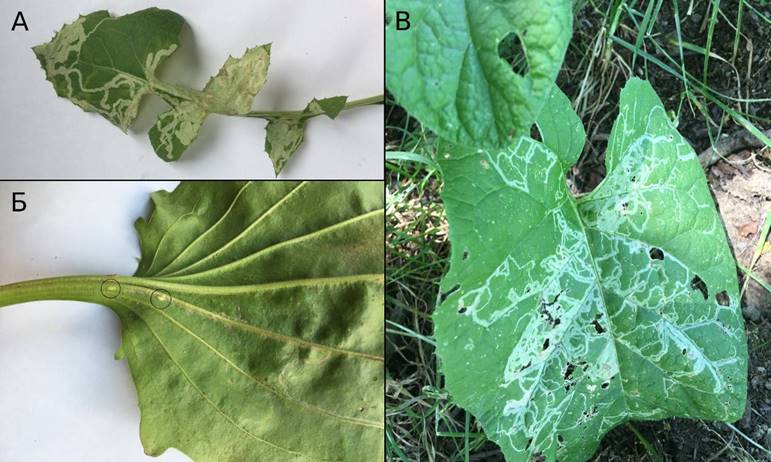 Личинки образуют беловатые, узкие, линейные мины как на верхней, так и на нижней поверхности листовой пластинки, а также и на черешке (рис. 2: Б). На нижней поверхности листа мины более длинные – 11,5–13 см, а на верхней поверхности размеры их колеблются в пределах 9–10,5 см. Частицы выделений личинок более крупные и расположены далеко друг от друга. Развитие личинки при температуре +24 ± 1°C длится 5–6 дней. Окукливаются в конце мины, около главной и боковых жилок или на поверхности черешка, выпячивая передние черные дыхальца из эпидермиса. Задние дыхальца куколки состоят из 12 пор (рис. 3: В). Развитие куколки длится 7–13 дней и зависит от температуры окружающей среды: при температуре +22 ± 1°C развитие длится 13 дней. Интенсивность поврежденности растений и их листьев составляет, соответственно, 80%, а экстенсивность – 90%.