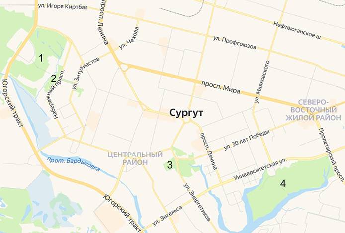 Рисунок 1 – Карта точек отбора проб: 1 – парк «Кедровый Лог», 2 – парк «Нефтяник», 3 – парк «Энергетиков», 4 – парк «За Саймой»