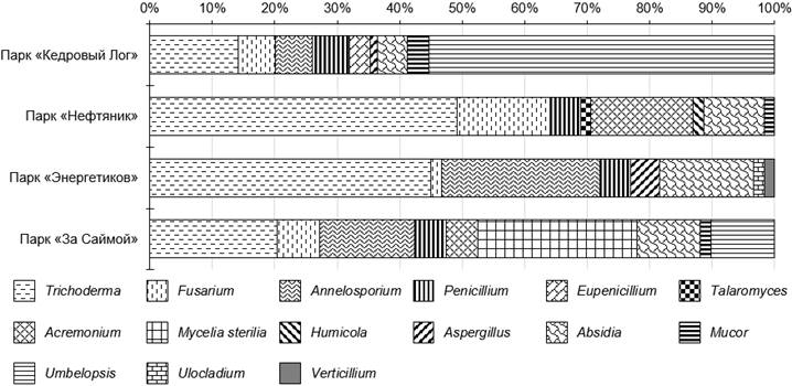В исследовании обилия родов почвенных грибов верхнего слоя подстилки парков г. Сургута (рис. 2) выявлено, что в парке «Кедровый Лог» обилен род Umbelopsis (55%), также род Trichoderma (14%). В парке «Нефтяник» преобладает род Trichoderma (49%), также Acremonium (16%), Fusarium (15%) и Absidia (10%). В парке «Энергетиков» обильны роды Trichoderma (47%), Annellosporium (25%) и Absidia (15%). В парке «За Саймой» обильны микромицеты группы Mycelia sterilia (25%), Trichoderma (20%) и Annellosporium (15%).