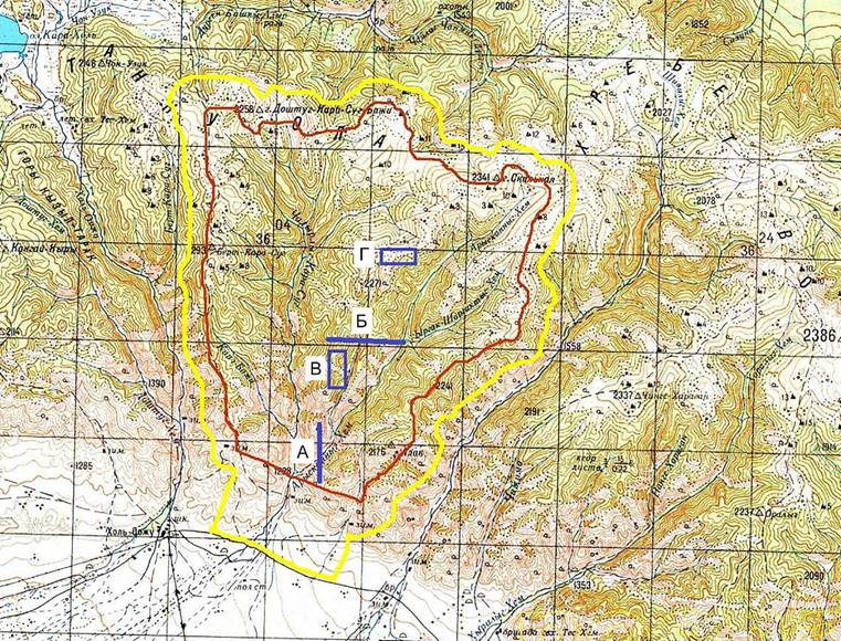 2) крупномасштабное картографирование: В – правый борт р. Тулалаган – лесостепной пояс, Г – верхний участок (высокогорный пояс, верховье р. Тулалаган).