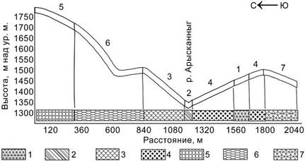 Правый борт р. Арысканныг имеет сложный пересеченный рельеф с эрозионными ложбинами, на 90% покрытый лесной растительностью. В пределах профиля они образуют чередующиеся комплексы разных типов лесов (рис. 4: № 6, № 7), обусловливая неоднородность общего сложения растительного покрова.