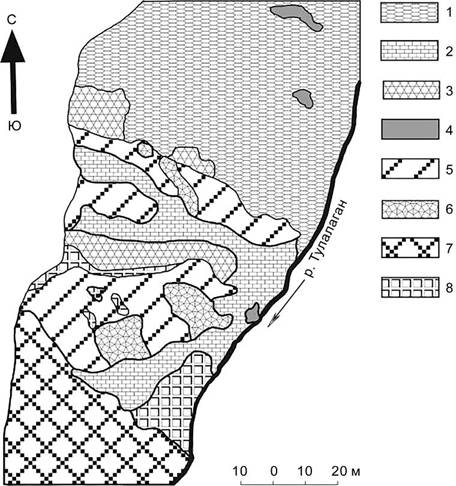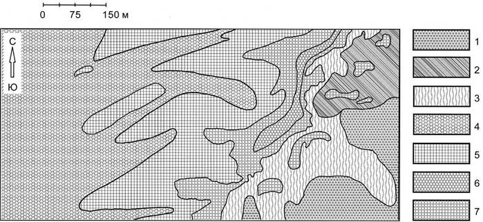 Распределение тундровых сообществ на одном из ключевых участков покажем на рисунке 6, где обобщенная пространственно-структурная организация растительности представлена в виде схемы мезокомбинации, составленной с использованием методических подходов Б.Б. Намзалова [19; 20].
