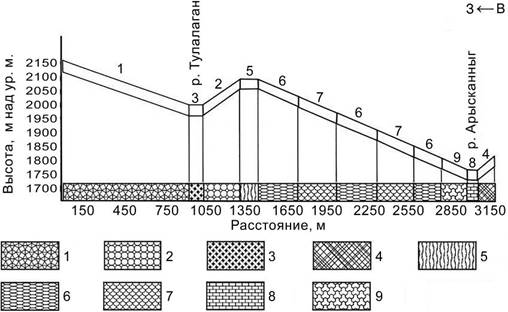 Рисунок 4 – Распределение растительности по геоботаническому профилю в горно-таежном поясе кластера «Арысканныг». I. Леса: 1 – зеленомошно-бруснично-жимолостный кедровый (Pinus sibirica, Lonicera altaica, Vaccinium vitis-idaea) лес; 2 – ерниковый кедровый (Pinus sibirica, Betula rotundifolia) лес редкостойный; 3 – зеленомошно-ерниково-голубичный лиственничный (Larix sibirica, Vaccinium uliginosum, Betula rotundifolia) лес редкостойный; 4 – зеленомошно-бруснично-багульниковый рододендроновый лиственничный (Larix sibirica, Rhododendron dauricum, Ledum palustre, Vaccinium vitis-idaea) лес; 5 – рододендроновый лиственничный (Larix sibirica, Rhododendron dauricum) лес послепожарный. Комбинации с участием лесных сообществ: 6 – комплекс можжевелово-овсяницево-брусничных (Pinus sibirica, Vaccinium vitis-idaea, Festuca rubra, Juniperus pseudosabina) и зеленомошно-брусничных кедровых (Pinus sibirica, Vaccinium vitis-idaea) лесов; 7 – комплекс злаково-бруснично-рододендроновых лиственничных (Larix sibirica, Rhododendron dauricum, Vaccinium vitis-idaea, Calamagrostis obtusata, Poa sibirica, Festuca rubra) и мятликово-вейниковых кедровых (Pinus sibirica, Calamagrostis obtusata, Poa sibirica) лесов. II. Заросли кустарников пойменного экологического ряда: 8 – дазифорово-ивовые (Salix coesia, Dasiphora fruticosa, Betula rotundifolia, Equisetum scirpoides) ообщества. III. Степи настоящие: 9 – разнотравно-сантолинополынно-кустарниковая (Caragana bungei, Spiraea media, Artemisia santolinifolia, Avenula hookeri, Potentilla evestita, Carex pediformis) степь