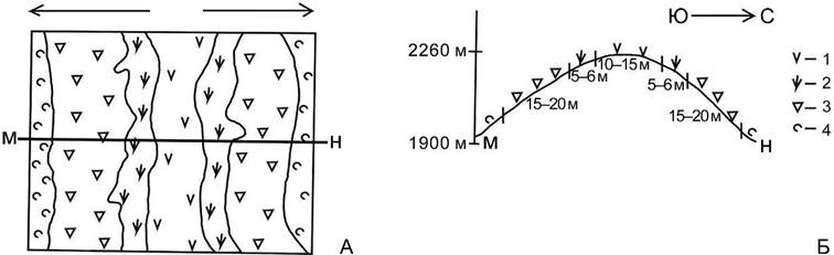 Рисунок 6 – Мезокомбинация на склонах гряды разных экспозиций: А – план; Б – профиль; МН – линия профиля, стрелками указано направление уклона поверхности. Сообщества: 1 – сочетания лишайниковых и щебнистых горных тундр; 2 – сочетания лишайниково-дриадовых и осоково-дриадовых горных тундр; 3 – сочетания лишайниково-дриадовых и шикшиево-ерниковых горных тундр; 4 – сочетания ерниковых тундр с лиственнично-кедровыми редколесьями из Larix sibirica и Pinus sibirica