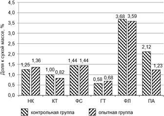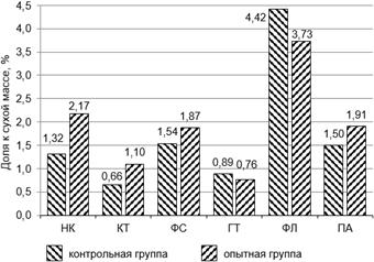 В июле 2019 г. выпало 161% от региональной нормы осадков и в почве накопились значительные запасы влаги. Вследствие этого в августе уровень накопления вторичных метаболитов снизился в листьях обеих групп модельных деревьев дуба. Среднее содержание ФЛ в контрольной группе снизилось на 16,7% и составило 3,683 ± 0,164% с.м. Уровень накопления этих веществ в листьях опытной группы снизился менее существенно и составил 3,594 ± 0,153% с.м. (рис. 2).