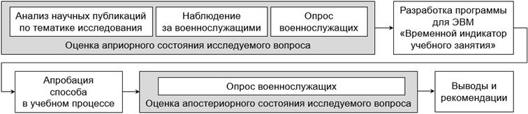 Рассмотрением вопроса контроля времени учебного занятия в академии занимался В.Н. Чепагин, который предложил вариант оптимизации времени учебного занятия посредством применения инверсной технологии обучения, которая позволяет минимизировать непродуктивные затраты учебного времени [5, с. 213]. Также в работе [6, с. 10] автор рассмотрел оптимизацию времени учебного занятия с помощью перераспределения временных отрезков занятия с учетом необходимого обучающимся количества информации с применением компьютерных технологий.