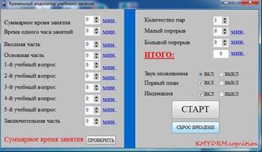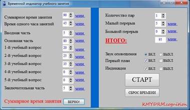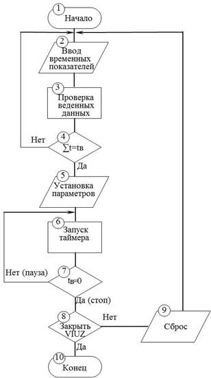В блоке 1 производится запуск программы VIUZ. Далее вводятся основные временные показатели (блок 2). В блоке 3 осуществляется проверка введенных временных показателей с помощью нажатия на кнопку «проверить». При условии, что введенные временные показатели (tB) равны суммарному времени занятия (∑t) (блок 4), осуществляем переход на следующий этап (в блок 5), иначе возвращаемся к блоку 2. В блоке 5 производим пользовательскую настройку временных параметров методических частей учебного занятия (включаем/отключаем такие параметры, как: звук оповещения; первый план; индикация). Нажимаем кнопку «старт», запускается таймер (блок 6). Если в ходе работы таймера появляется необходимость его остановки, нажимаем кнопку «пауза» (блок 7) и в дальнейшем переходим к блоку 6. По истечению введенного времени в блоке 8 проверяем выполнение условия закрытия программы. При дальнейшей работе с программой осуществляем переход к блоку 9 и выполняем сброс временных параметров, а затем возвращаемся к вводу временных показателей, в противном случае осуществляем ее закрытие (блок 10). Разработанная программа дает возможность преподавателю не отвлекаться на контроль временных интервалов при проведении учебных занятий. Согласно заданным параметрам, VIUZ с помощью звуковых сигналов или/и индикаторной шкалы сообщит о приближающемся перерыве, а также о начале занятия. В результате разработанная программа имеет интерфейс в виде диалоговых окон, представленных на рис. 3, 4 и временных диаграмм, изображенных на рис. 5. Работа с программой производится на интуитивном уровне и не требует дополнительного обучения. По умолчанию в диалоговом окне программы уже установлены временные значения для одного занятия продолжительностью 90 мин. Кроме того, установлены: время одного академического часа занятий; время вводной и заключительной частей; количество пар занятий (до 4-х пар). Однако в случае необходимости временные значения устанавливаются руководителем занятий самостоятельно, для этого всего лишь необходимо нажать кнопку «Сброс времени» и выставить необходимые значения вручную. Интервал временных границ занятия программно не ограничен. После установки временных значений методических частей занятия имеется возможность проверить правильность ввода, нажав кнопку «Проверить». В качестве дополнительных настроек предусмотрена возможность включения/выключения звукового оповещения, вынос временного индикатора на первый план всех диалоговых окон, а также установлена возможность включения/выключения шкалы индикации.