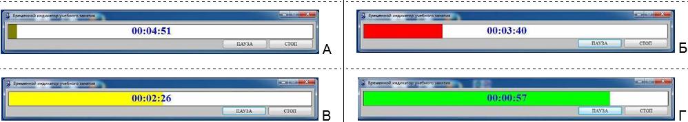 Рисунок 5 – Вид окна временной диаграммы с таймером обратного отсчета разных методических частей занятия. А – вводная часть; Б – основная часть (1-й учебный вопрос); В – основная часть (2-й учебный вопрос); Г – заключительная часть