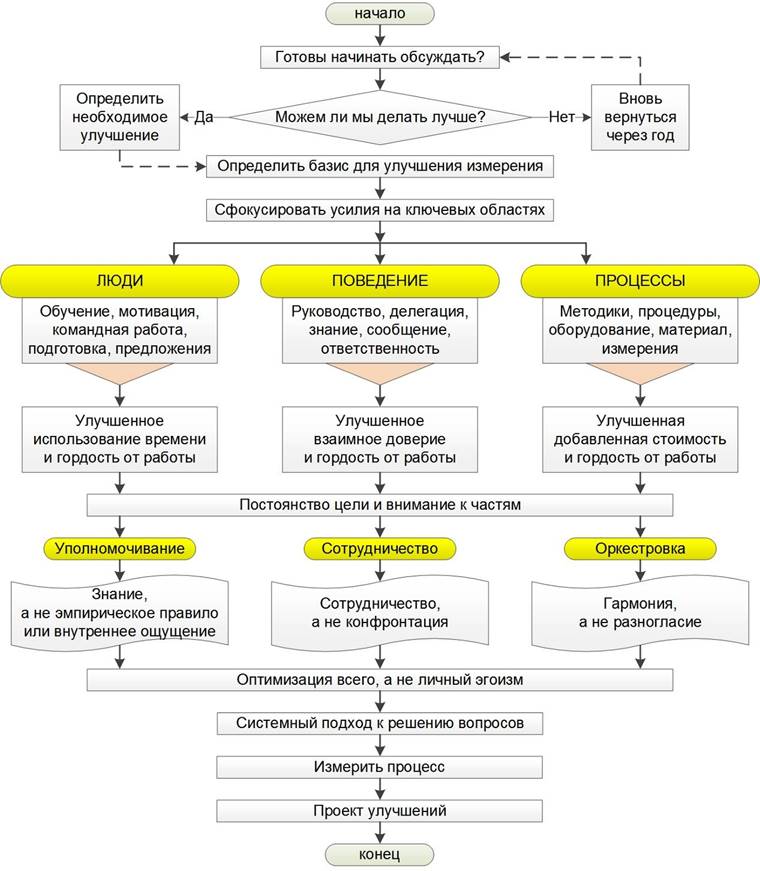 Основными постулатами в формировании эффективного инженера, командира и руководителя являются научный подход и новая культура в сфере отношений во вверенных коллективах. Научный подход основан на статистическом мышлении, в основу которого входит анализ состояния выявленных существенных процессов деятельности и их улучшение по статистическим параметрам. В отношениях среди членов коллектива – это создание такой атмосферы, при которой возникает высокий синергетический эффект. Для стимулирования появления такого эффекта прежде всего необходимо, чтобы каждый член коллектива мог видеть свою деятельность в составе общего процесса и понимать свою роль в улучшении этого процесса. Таким образом, в списках того, что должен каждый руководитель изучить, первым пунктом стоит умение разрабатывать диаграммы последовательных действий (блок-схемы процессов), за которые он несет ответственность, а также описывать эти процессы, находить способы их улучшения, т.е. заниматься моделированием [13, с. 20–38; 14].