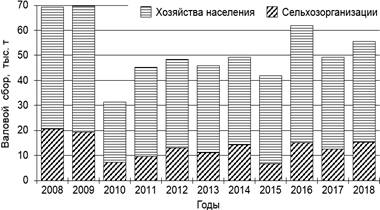 Рисунок 1 – Вклад хозяйств населения и сельскохозяйственных организаций в производство плодовой продукции – валового сбора плодов, ягод и винограда – в Самарской области (построено по данным [13])
