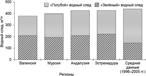 Рисунок 5 – Результаты расчета водного следа при выращивании апельсинов в различных регионах Испании, данные водопотребления 2019–2020 гг. (из: [31])
