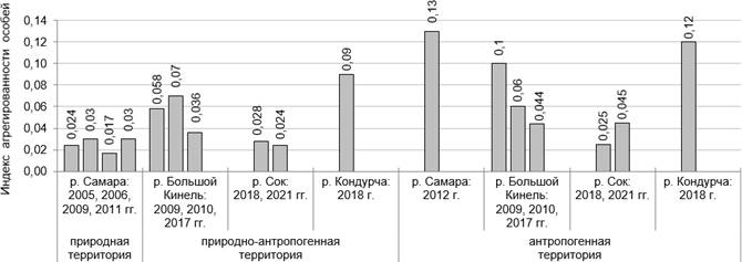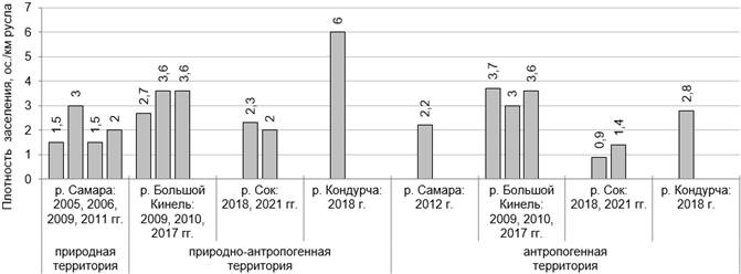 Показатель частного обилия бобров на участках русла рек, без учета значительных буферных зон, на природной территории составляет 1,65–2,4 особей/км, а на природно-антропогенных и антропогенных территориях – 1,5–7,5 особей/км (рис. 2). Малый показатель частного обилия на реке Сок (1,5–2,5 особей/км) объясняется низкой плотностью заселения русла в целом (0,9–1,4 особей/км).