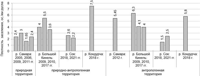Рисунок 1 – Плотность заселения участков русла исследованных рек Самарской области, особей/км