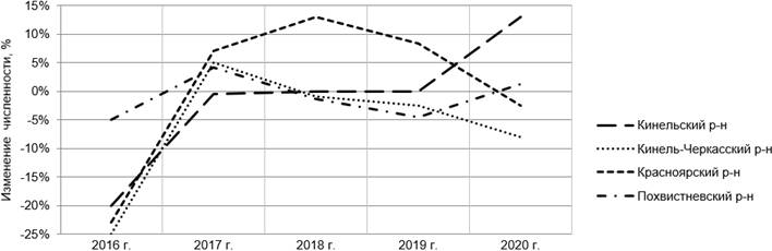 Рисунок 5 – Рост и убыль численности бобров (% от прошлого года) по муниципальным районам Самарской области с 2016 по 2020 гг. (данные охотреестра)