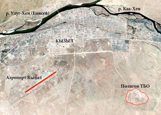 Городской полигон ТБО расположен в центре Улуг-Хемской котловины на левом коренном берегу долины р. Улуг-Хем (Енисей), в привершинной части сухого лога, понижающегося к северу в сторону города, в поле развития коренных отложений юрского возраста, представленных песчаниками, аргиллитами, алевролитами. Коренные породы перекрыты маломощным чехлом (5–7 м) делювиально-пролювиальных образований, представленных дресвяно-щебнистыми отложениями, супесями, песками. Растительный покров – настоящие дерновинно-злаковые степи, кустарниковые карагановые-полынно-злаковые степи. В пределах полигона распространены участки бурьянистой растительности, кустарники; древесная растительность практически отсутствует, кроме нескольких молодых ильмов у границы полигона и вдоль дороги, ведущей к нему.
