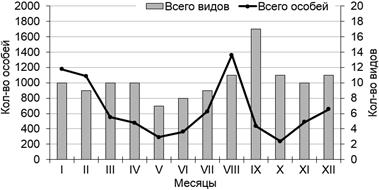 Наибольшее видовое разнообразие птиц полигона характерно для периода наиболее интенсивных осенних миграций, приходящегося на сентябрь, в этот период количество отмеченных видов оказалось почти вдвое выше, чем в любой другой месяц года. Выраженный минимум видов отмечен в мае, последующий период до августа характеризовался низким видовым разнообразием. Поздней осенью и зимой число видов оставалось стабильным (10–11 видов) (табл. 1).
