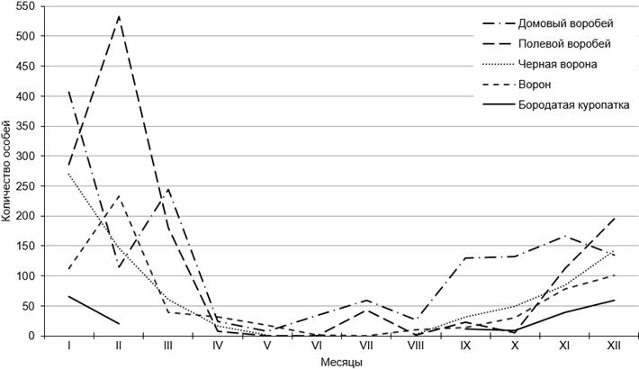 В холодный период с октября по март доминирующими видами на полигоне являются домовый и полевой воробьи, составляющие вместе 50,6–77%, а также ворон и черная ворона, составляющие 32,3–62,4%, доля этих четырех видов вместе достигает 87–97% от общего числа птиц на полигоне зимой (рис. 3).