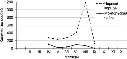 В теплый период с конца марта до середины сентября на полигоне преобладают черный коршун и монгольская чайка (рис. 4), воробьи хоть и встречаются в этот период, но в значительно меньшем количестве, чем в другие сезоны года, и составляют от 2,8 до 11%.