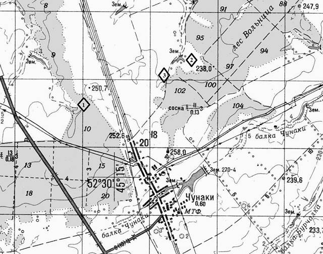 Рисунок 1 – Расположение выявленных солонцовых участков в Малосердобинском районе Пензенской области: 1 – памятник природы «Даниловская солонцовая поляна»; 2 – Чунакская солонцовая поляна; 3 – Корзовая лощина. Масштаб 1:100 000