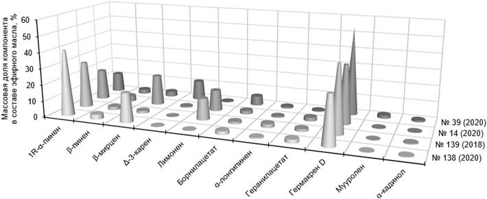 Содержание эфирного масла в надземной фитомассе растений варьировало от 0,85 до 1,7% в пересчете на абсолютно-сухое сырье. В составе ЭМ достоверно идентифицировано 39 компонентов, девять из которых являлись основными. Доминирующими соединениями являлись α-пинен (до 43,9%), мирцен (до 18,2%), лимонен (до 13,2%), Δ-3-карен (до 12,0%); из сесквитерпеноидов: гермакрен D (до 54,3%), борнилацетат (до 5,8%), геранилацетат (до 2,4%), кадинадиен (до 2,0%), сескви-фелландрен (до 1,4%).