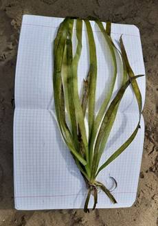 24.08.2021 г. валлиснерия спиральная вновь была зарегистрирована нами среди зарослей водных макрофитов в акватории старицы реки Сок (рис. 3). Были взяты образцы для гербаризации. Растение обитало в основном на песчаном грунте, местами илистом, на глубине около 80 см, в стоячей воде, не образовывало сплошных зарослей, а встречалось в виде единичных особей. Растение в среднем имело размер до 35 см, в розетке отмечено до 15 листьев, длина корневой системы до 3 см (рис. 4). Отмечены только вегетативные особи. Сопутствующими высокотравными воздушно-водными видами растений были Typha angustifolia L., Butomus umbellatus L., Carex acuta L., а также Sagittaria sagittifolia L. Из погруженных и плавающих водных макрофитов в месте обитания валлиснерии были встречены Caulinia minor (All.) Coss. et Germ., Najas major All., Salvinia natans (L.) All., Nuphar lutea (L.) Smith., Nymphaea candida C. Presl., Ceratophyllum demersum L., Potamogeton perfoliatus L., Potamogeton obtusifolius Mert. et Koch., Lemna minor L., Spirodela polyrhiza (L.) Schleid.