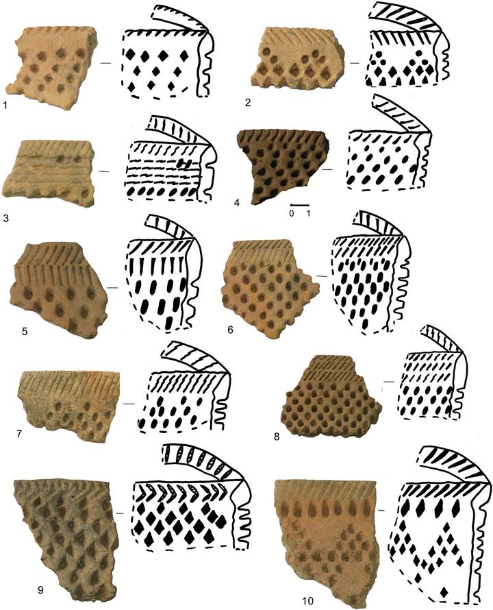 Рисунок 1 – Ромбо-ямочная керамика Вологодского края (1–10 – стоянка Базега)