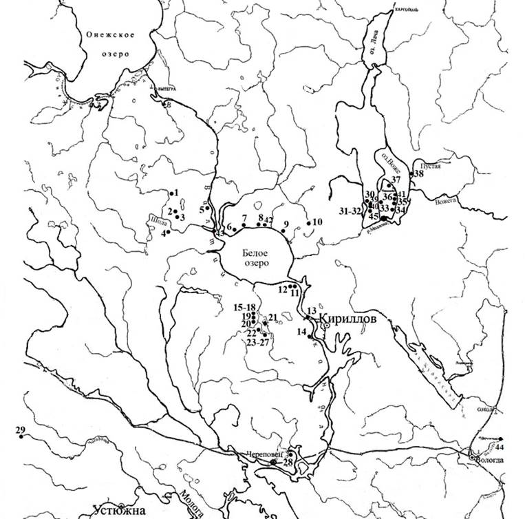 Рисунок 2 – Карта-схема памятников с ромбо-ямочной керамикой на территории Восточного Прионежья и в бассейне р. Шексны (1 – Базега; 2 – Лундозеро I; 3 – Исток Сойды; 4 – Яглобойская; 5 – Кителка; 6 – Орлово; 7 – Водоба; 8 – Костебалка; 9 – Вьюшино; 10 – Роксома; 11 – Белоозеро; 12 – Пески; 13 – Федосьин городок; 14 – Иванов Бор; 15 – Попова Гора; 16 – Пальцево; 17 – Пальцевский остров; 18 – Пальцев мыс; 19 – Левково; 20 – Яковлево; 21 – Клюковец; 22 – Чирково; 23 – Васькин Бор и Кривая Береза; 24 – Камышовая; 25 – Северный залив; 26 – Угловая; 27 – Старцев остров; 28 – Колмакское озеро 2; 29 – Чагода; 30 – Мыс Святого озера (Святое озеро I); 31 – Лохтовская лучина; 32 – Костромская лучина (Вещее озеро); 33 – Караваиха; 34 – Мыс Вязовый; 35 – Мыс Бык; 36 – Три Сосны; 37 – Сенная 1; 38 – Пустая 8; 39 – Лучиново (Вещозеро I); 40 – Вещозеро II; 41 – Мыс Бревенный; 42 – Водоба II; 43 – Устье Шолы I; 44 – Векса III; 45 – Против Гостиного берега)