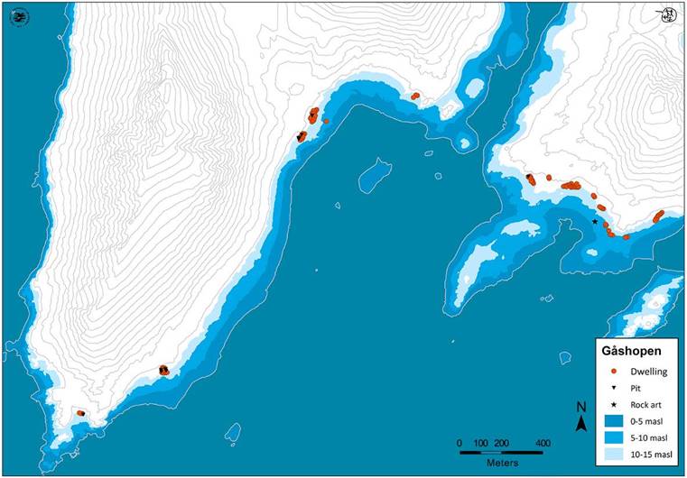 Figure 3 – Spatial distribution of sites at Gåshopen on Sørøya with reconstructed shorelines at 5, 10 and 15 masl (map by M.S. Lundgren, UiT)
