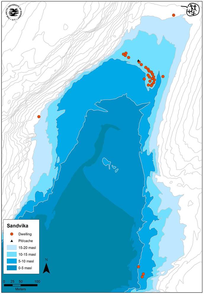 Variation in dwelling size and construction principles may be related to functional variation on different levels, such as different types of activities or different numbers of residents in each house. Differences may be linked to seasonal variations. The number of dwellings at a site and the local topography may indicate the role of a site within the settlement organization. Sites such as Sandvika, with many dwellings spread across different heights above sea level, good landing, shelter, fresh water and closeness to a variety of resources, are likely to have served as residential bases in many different chronological periods. Sites with fewer dwellings and sites placed on exposed points are more likely to be short term sites, used when on the look-out for and exploiting specific resources.