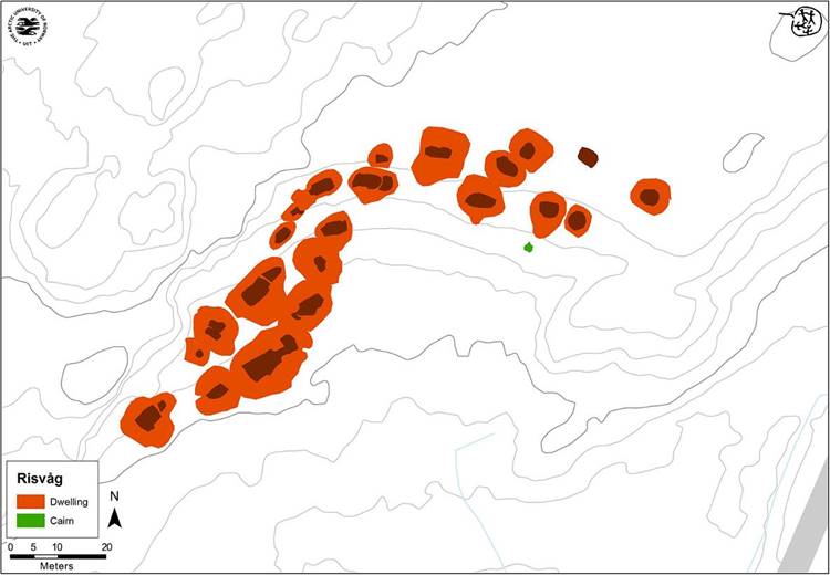 Figure 5 – Detailed map of dwelling structures in Risvåg, Sørøya, Norway, based on CPOS measuring. Shown with 1 m elevations (map by S.G. Therkelsen, UiT)