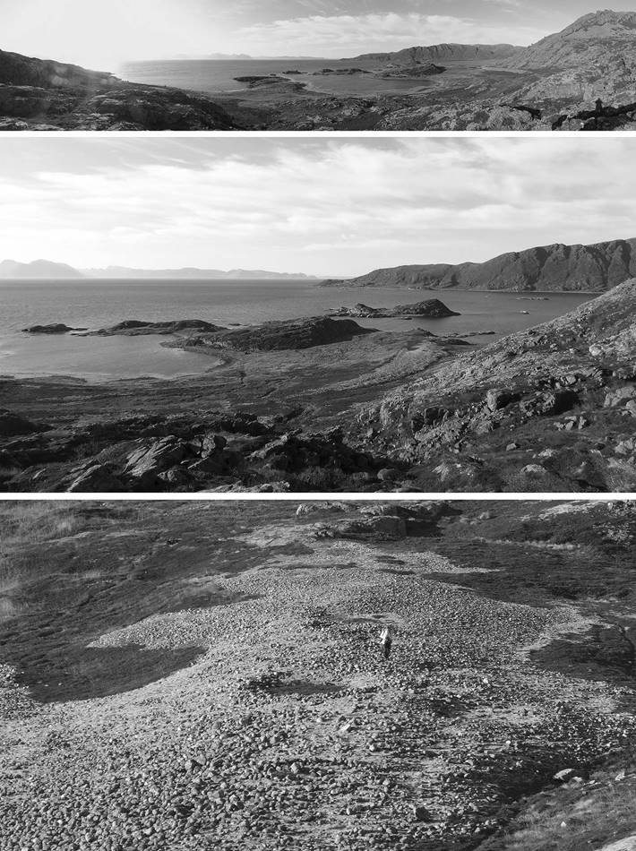 Figure 6 – Three levels of dwelling documentation at Taborshamn, Sørøya, Norway. From the wider seascape, via the site area, to the single house structures (photos and collage by J.M. Gjerde, NIKU)