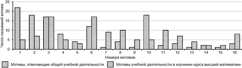 Таблица 1 – Соотношение количества называний мотивов в области профессионального обучения и при изучении курса высшей математики