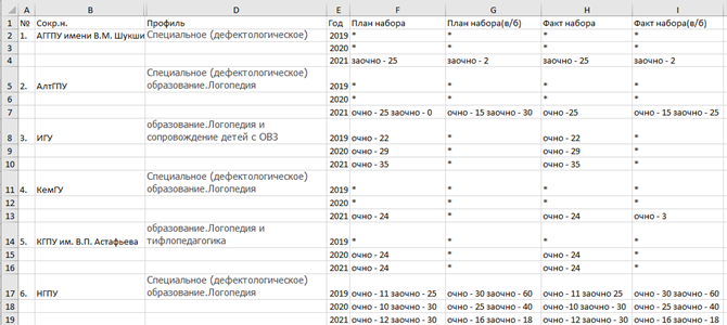 Отметим дополнительно, что выполнение данного задания выявило ряд незапланированных сложностей, как связанных, так и не связанных с дистанционной формой обучения. Лишь около 20% студентов группы имели личный компьютер в постоянном доступе, остальные использовали для учебного процесса MS Teams на мобильном устройстве, а к ноутбуку или стационарному персональному компьютеру имели лишь гостевой доступ, без возможности установки дополнительного ПО (а зачастую еще и с ограничениями по времени). Также практика показала крайне низкий уровень знаний по требуемым разделам базового курса информатики – опыт работы в электронных таблицах имели менее 25% студентов, лишь 2 студента из 34 помнили о концепции реляционных таблиц. Как результат, первая попытка выполнения п. 1 из данного задания привела примерно к такому результату, отображенному на рис. 2, что, очевидно, не является форматом, пригодным для машинной обработки данных.