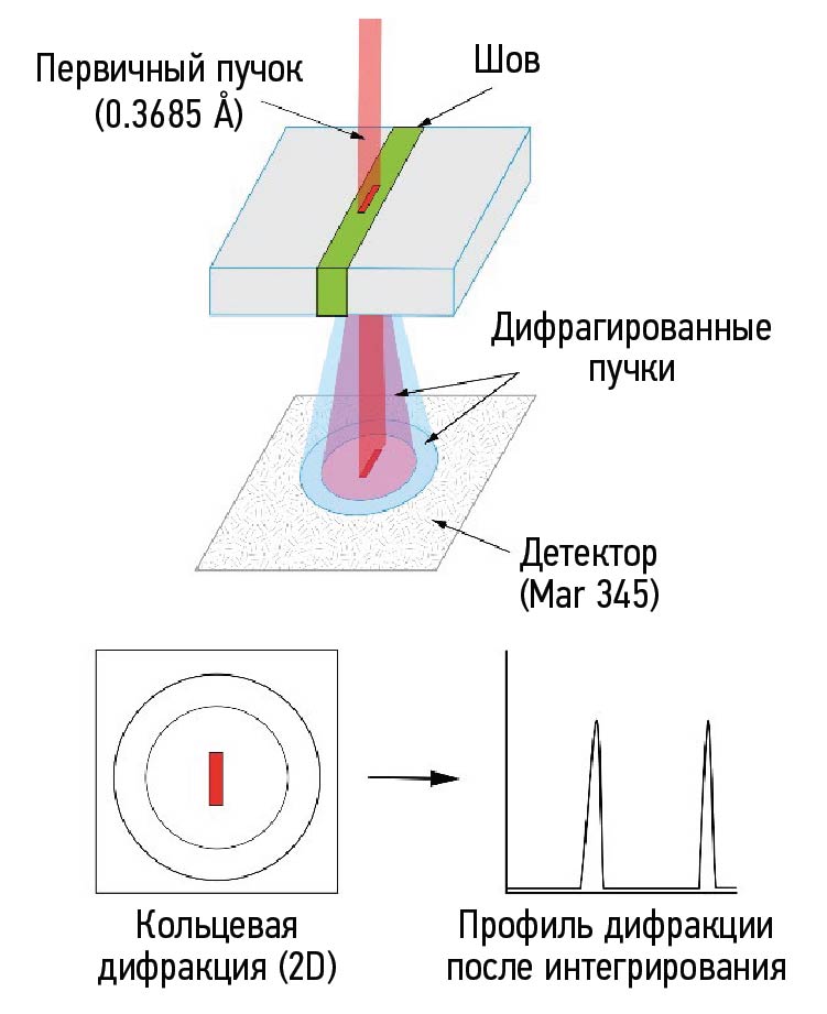 Рентгенофазовые исследования проводились при помощи анализа дифракции синхротронного излучения (СИ), полученной на 8-м канале экспериментальной станции накопительного кольца ВЭПП-4 «Диагностика рентгеновским излучением высоких энергий» на базе электрон-позитронных ускорителей комплекса ВЭПП-4 — ВЭПП-2000 в Институте ядерной физики СО РАН [4]. Накопление сигнала (рис. 1) происходило в геометрии Дебая – Шеррера на плоском двумерном детекторе Mar345 (MarResearch, Германия). Накопление сигнала происходило в центре сварного шва и на удалении от него на ~5 мм по обе стороны от него (для исследования исходных сплавов). Длина волны составляла 0,2591 Å (47,85 кэВ). Пучок имел квадратное сечение с размером сторон 300 мкм. Дистанция между образцом и детектором составляла примерно 610 мм. Толщина образцов — 2 мм. Двумерные картины дифракции преобразовывались в одномерные посредством интегрирования вокруг центрального рефлекса при помощи Area Diffraction Machine [5]. Анализ полученных картин дифракции осуществлялся путем соотношения положений полученных рефлексов теоретическим положениям для предполагаемых фаз, рассчитанным согласно кристаллографической информации в базе данных Springer Materials [6, 7] и в работе [8]. При построении профилей дифракции каждый из них был нормализован на максимальное значение внутри соответствующего набора данных.
