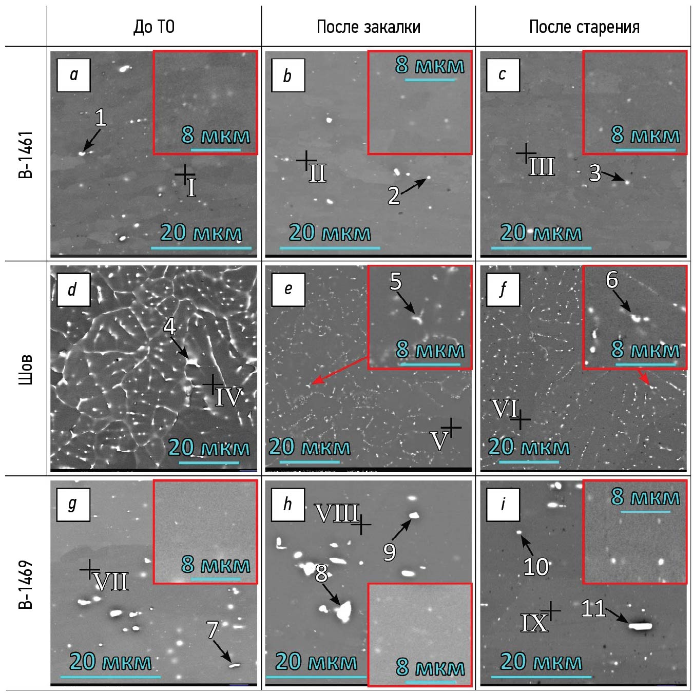Рис. 3. Микроструктура (РЭМ) до и после каждого этапа ТО сплава В-1461 (a–c), сварного шва (d–f) и сплава В-1469 (g–i).