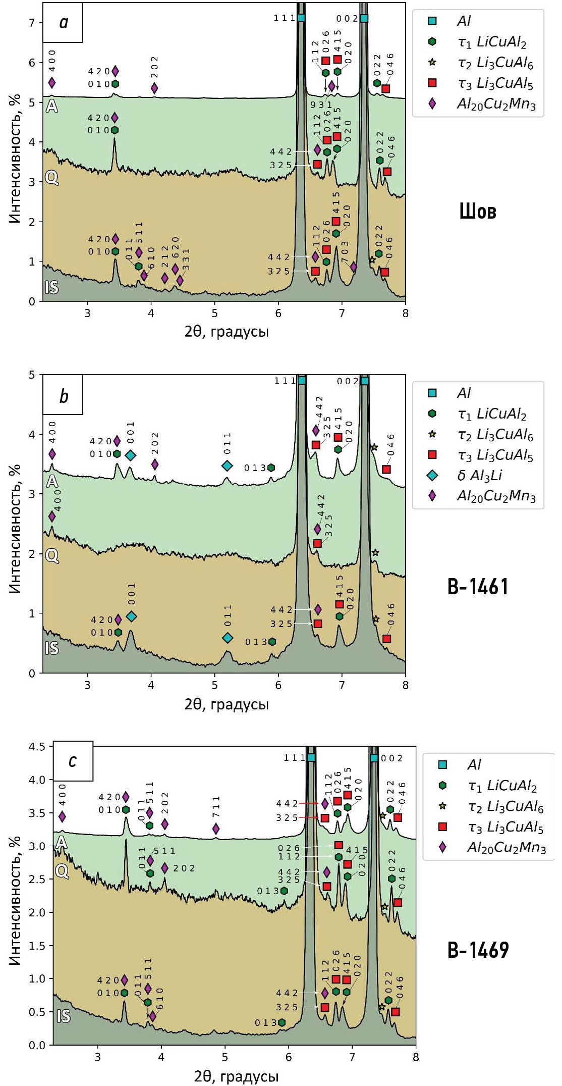 Анализ дифракции СИ показал существенные изменения в качественном фазовом составе сварного соединения (рис. 4, a). В отличие от В-1461 (рис. 4, b), в сварном шве не наблюдается рефлексов δ’-фазы. К тому же пики фаз τ1-3 и Al20Cu2Mn3 заметно слабее, нежели в сплаве В-1469 (рис. 4, c).