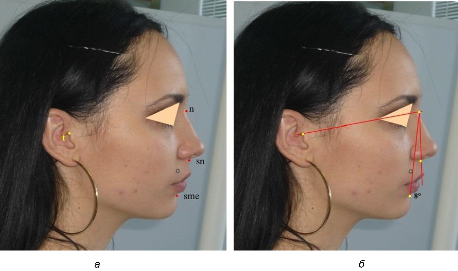 Лицевой межгнатический угол по кожным ориентирам строили соединением точек sn-n-sme, который обозначали как назально-супраменталь-ный угол (рис. 1).