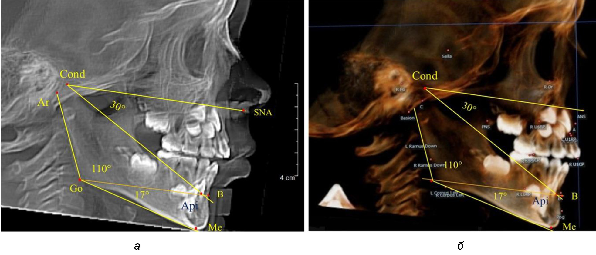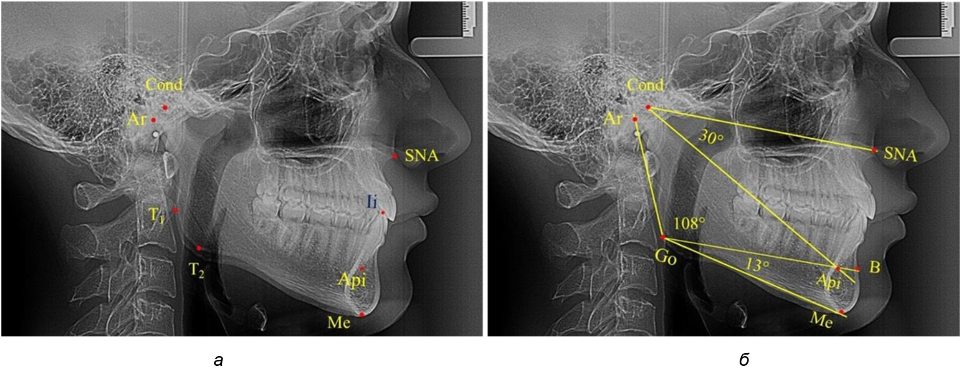 Рис. 1. Расположение реперных точек (а) и линий (б) для оценки угловых параметров гнатической части телерентгенограммы