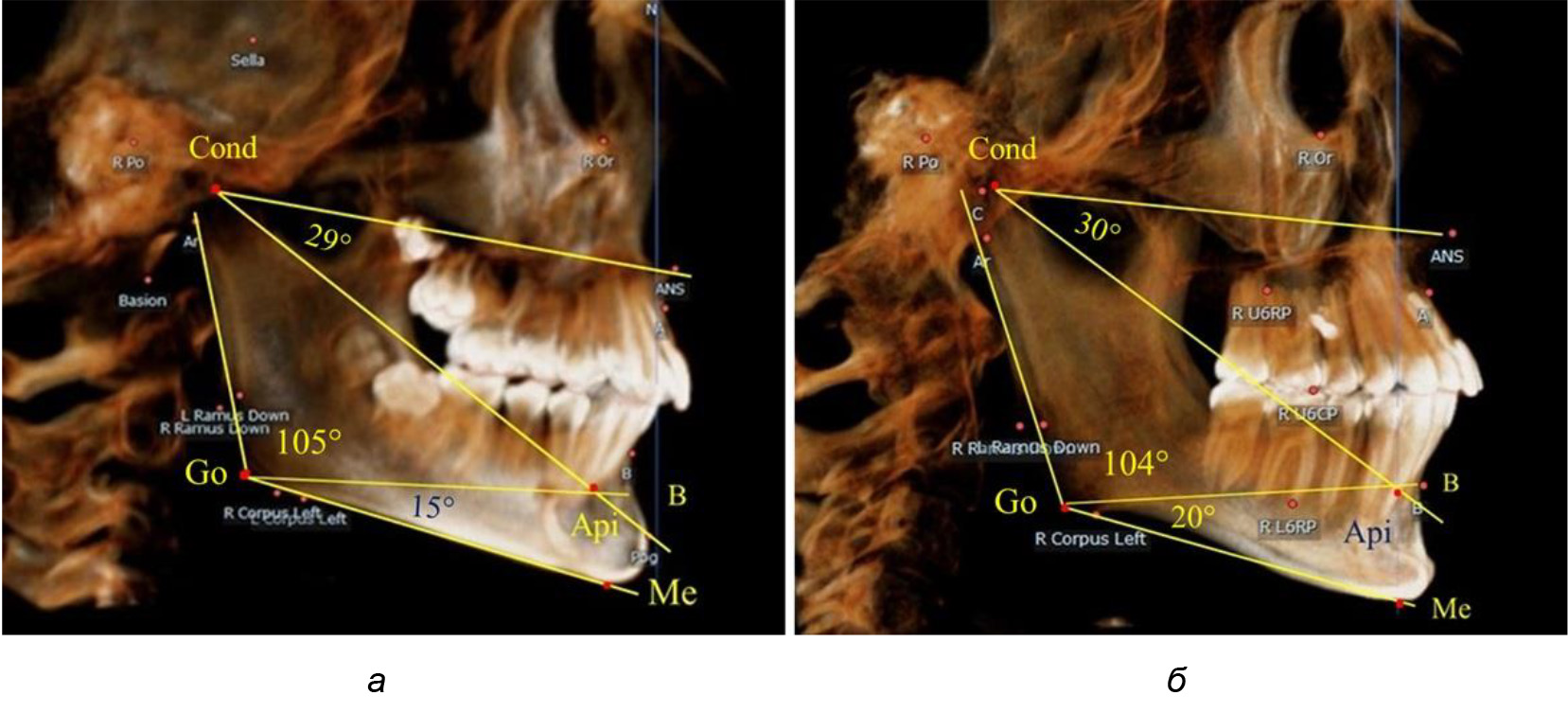 Для горизонтального типа роста было характерно достоверное р ˂ 0,05 уменьшение нижнечелюстного угла до (115,57 ± 0,56)°. Величина угла Ar-Go-Api составила (102,71 ± 1,62)°, а угол Api-Go-Me был (12,86 ± 0,74)° (рис. 3).
