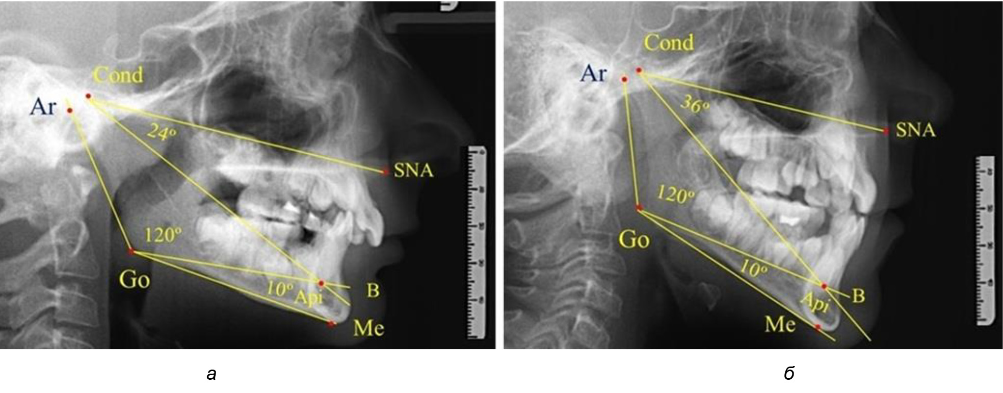 Через апикальную точку нижнего резца от суставной точки проводили линию Cond-Api, которая с линией Cond-SNA образовывала угол гнатический части лица SNA-Cond-Api, используемый для оценки ее основных параметров.