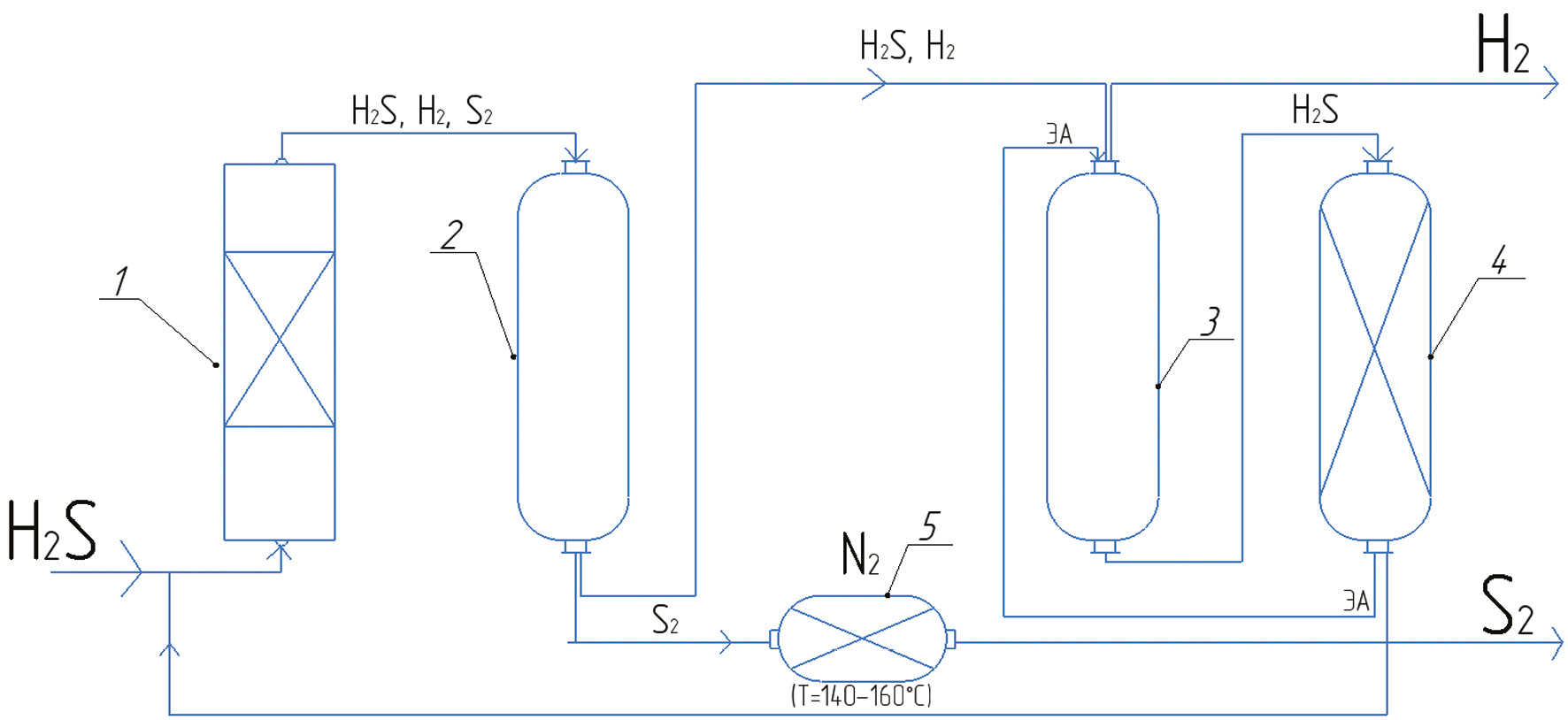 Рис. 1. Разработанная принципиальная технологическая схема разложения сероводорода на водород и серу