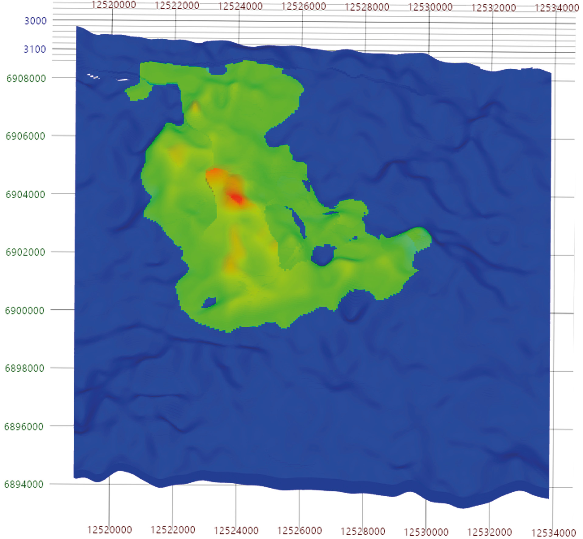 В работе моделируется пласт Ю10, осложненный тремя вертикальными разрывными нарушениями сбросового типа [1]. Вертикальные разрывные нарушения сбросового типа необходимо учитывать при геометризации залежи. Вследствие данных нарушений происходит изменение структуры и строения залежи. В данной модели считается, что разломы, находящиеся в центральной зоне, не влияют на геометризацию залежи, но разлом, проходящий на севере, изменяет структуру залежи. Таким образом, о наличии нефтенасыщенных толщин на северном блоке можем только предполагать, также наличие нефти в северном блоке не подтверждается бурением. Исходя из этого, северный блок не учитывается в подсчете запасов. После геометризации залежи был получен куб коэффициента нефтенасыщенности, который отображает объем нефтеносности (рис. 1). После данного построения был произведен подсчет запасов моделируемого участка пласта Ю10 по следующей формуле (1):